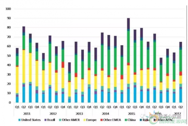 總體而言,2017年第2季度全球可再生能源投資總額為648億美元,比2016年第二季度下降了12%。具體而言,太陽能投資在這一季度達(dá)到356億美元,比去年同期上升了19%;而風(fēng)電投資只有262億美元,比去年同期下降了29%。