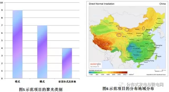 “十二五”發(fā)展落實情況:截至2015年底,全國已建成實驗示范性太陽能熱發(fā)電站(系統(tǒng))6座,裝機規(guī)模為1.388萬千瓦;2016年9月,國家能源局印發(fā)《關(guān)于建設太陽能熱發(fā)電示范項目的通知》(國能新能[2016]223號),確定第一批20個太陽能熱發(fā)電示范項目,其中包括9個塔式電站,7個槽式電站和4個菲涅爾電站,總計裝機容量134.9萬千瓦,分布見圖5。項目主要分布在青海省、甘肅省、河北省、內(nèi)蒙古自治區(qū)、新疆自治區(qū)五個省區(qū),其中以甘肅項目數(shù)最多,分布見圖6。