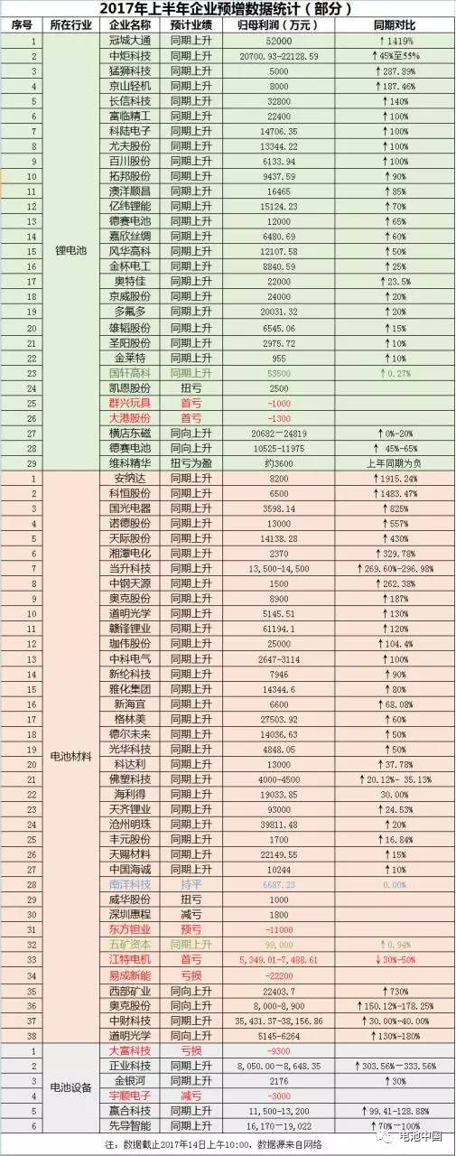 29家鋰電生產(chǎn)企業(yè)中,冠城大通預(yù)計2017年上半年業(yè)績同比增長1419%,領(lǐng)跑鋰電生產(chǎn)企業(yè);大港股份和群興玩具則出現(xiàn)首次虧損,虧損額分別為1300萬元和1000萬元。38家鋰電材料生產(chǎn)企業(yè)中,安納達(dá)、科恒股份領(lǐng)跑材料企業(yè),南洋科技利潤與上年同期持平,東方鉭業(yè)、江特電機、易成新能或出現(xiàn)不同程度的虧損。6家設(shè)備企業(yè)中,大富科技、宇順電子業(yè)績不佳,而正業(yè)科技漲幅最高,達(dá)約333%。