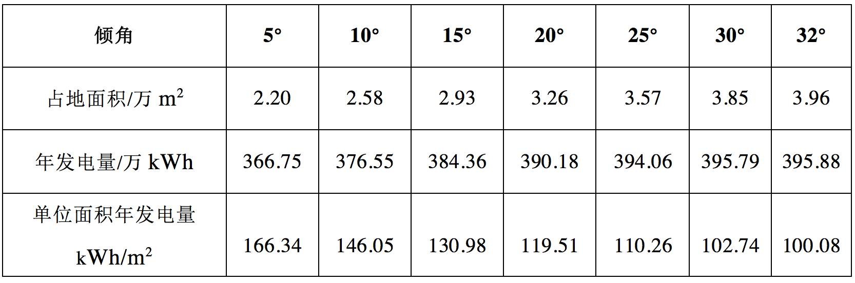 如果傾角降低,將導(dǎo)致發(fā)電量降低;然而同時(shí),占地面積將減少。對(duì)傾角為5°~32°時(shí),項(xiàng)目單位面積的發(fā)電量進(jìn)行計(jì)算,結(jié)果如下表。