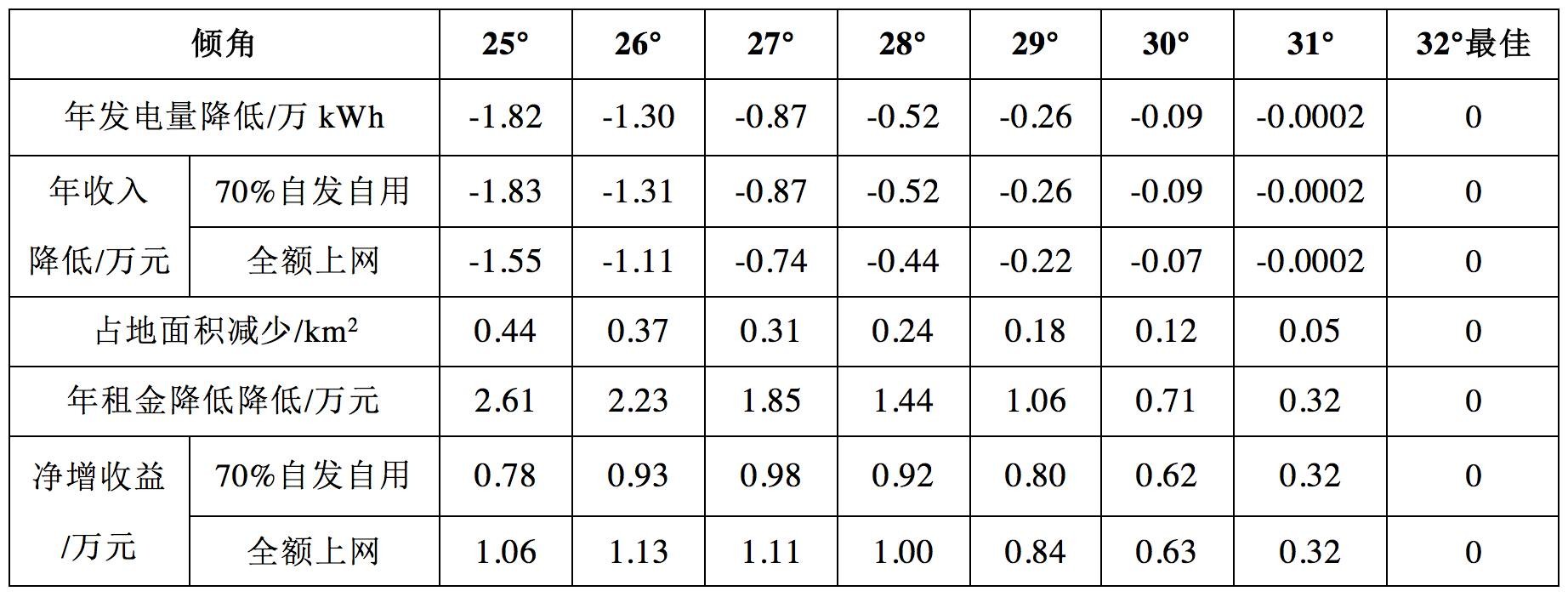 傾角變化的主要影響為非最佳傾角帶來發(fā)電量降低、減少占到從而節(jié)約租金。將兩項(xiàng)對(duì)比如下表。