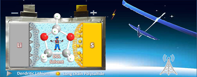 一直以來,科研人員使用硝酸鋰添加劑來解決上述問題,但是硝酸鋰、炭黑、單質(zhì)硫共存的電池體系存在安全隱患。該研究團隊首次設計出一類不含硝酸鋰的高性能電解液,兼具較低的多硫化鋰溶解度(Ksp)、較高的鋰離子傳導率、較高的單質(zhì)硫利用率和優(yōu)異的金屬鋰界面穩(wěn)定性。采用該電解液組裝的4000 mAh鋰硫電池器件,其比功率可達60 Wkg-1,比能量可達350 Whkg-1,且能穩(wěn)定循環(huán)30次以上,此技術有望使太陽能無人飛機連續(xù)飛行1個月。該工作為鋰硫電池電解液材料的設計制備提供了新思路。