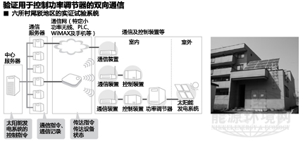 包括獨(dú)棟住宅原先設(shè)置的系統(tǒng)在內(nèi),試驗(yàn)共利用了5套太陽(yáng)能發(fā)電系統(tǒng)。功率調(diào)節(jié)器可通過(guò)聯(lián)盟成員NEC公司準(zhǔn)備的控制裝置進(jìn)行通信。從中心服務(wù)器,經(jīng)由通信服務(wù)器、通信網(wǎng)、通信分機(jī)及控制裝置向功率調(diào)節(jié)器發(fā)出控制指令。再由功率調(diào)節(jié)器按原路返回控制結(jié)果。