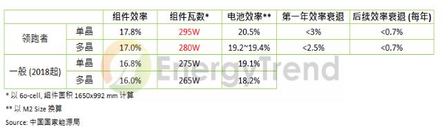 第三批領跑者計劃的組件轉(zhuǎn)換效率門檻訂在單晶17.8%,略低于先前《意見稿》的18%;而多晶則維持在17%。另一方面,國家能源局亦公布了2018年1月1日起的光伏組件門檻,整體60-cell組件之瓦數(shù)與電池轉(zhuǎn)換效率換算如下表: