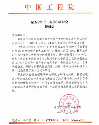 “中美工程前沿研討會(huì)”是中美兩國工程院間的一項(xiàng)重要合作機(jī)制,是兩國優(yōu)秀青年工程科技人員就共同關(guān)心的工程科技前沿問題開展交叉學(xué)科研討的重要平臺(tái)。自2009年起,研討會(huì)每兩年舉辦一次,分別在中國和美國輪流舉辦。每屆會(huì)議均由兩國工程院分別選出約30位本國優(yōu)秀中青年專家出席會(huì)議。本屆會(huì)議上,兩國專家圍繞儲(chǔ)能、智能交通、合成生物學(xué)和機(jī)器人等四大領(lǐng)域展開研討交流,電工研究所陳永翀被中國工程院遴選為中方儲(chǔ)能領(lǐng)域代表出席了此次研討會(huì)。