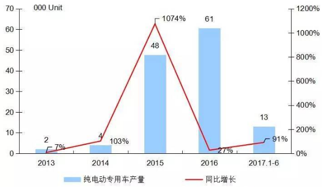 從下圖可知,以純電動(dòng)物流車(chē)為主的純電動(dòng)專(zhuān)用車(chē)市場(chǎng),自2013年以來(lái)一路高歌猛進(jìn),從2013年的約2000輛,發(fā)展到2015年的4.8萬(wàn)輛,2016年再度飆升至6.07萬(wàn)輛,同比增長(zhǎng)27%,相比2013年更是翻了29倍。而即使在財(cái)政補(bǔ)貼出現(xiàn)較大退坡的2017年,純電動(dòng)物流車(chē)市場(chǎng)仍然繼續(xù)快速增長(zhǎng),呈現(xiàn)出旺盛的發(fā)展勢(shì)頭。
