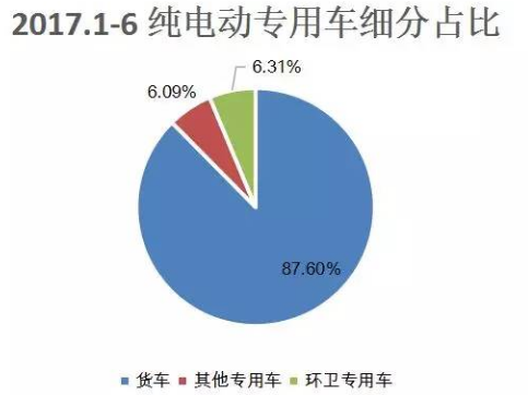 今年上半年,盡管純電動(dòng)物流車(chē)占比依然居高不下,但環(huán)衛(wèi)專(zhuān)用車(chē)占比開(kāi)始有所上升。從下圖可知,2017年1-6月,國(guó)內(nèi)純電動(dòng)物流車(chē)(貨車(chē)和廂式運(yùn)輸車(chē))占比為87.6%,比2016年的93.96%有所下降,但依然是絕對(duì)主力,也是各大車(chē)企主要投入的細(xì)分市場(chǎng);環(huán)衛(wèi)專(zhuān)用車(chē)占比從2016年的1.8%,擴(kuò)大到2017年的6.31%。