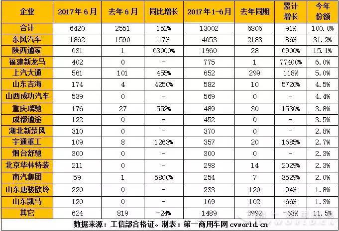 記者根據(jù)工信部合格證產(chǎn)量統(tǒng)計(jì)得知,2017年6月,國(guó)內(nèi)新能源專(zhuān)用車(chē)市場(chǎng)共計(jì)生產(chǎn)6420輛(全部為純電動(dòng)車(chē)型),比去年同期大幅增長(zhǎng)152%,其中大部分是純電動(dòng)物流車(chē);1-6月,純電動(dòng)專(zhuān)用車(chē)市場(chǎng)累計(jì)產(chǎn)量達(dá)到1.3萬(wàn)輛,比去年同期的6806輛增長(zhǎng)幾乎翻番,達(dá)到91%!