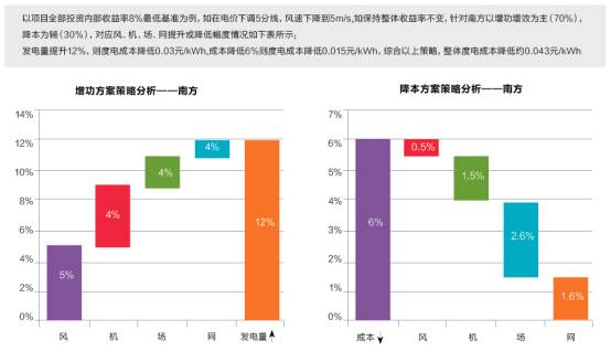針對北方風(fēng)電場和南方風(fēng)電場的不同特點(diǎn),曹志剛給出了具體的破局路徑:北方項目應(yīng)以降本為主,“通過擴(kuò)大項目規(guī)模,共用升壓站、接入送出系統(tǒng)、場內(nèi)道路等來拉低項目初始投資?!蹦戏巾椖繎?yīng)以提高發(fā)電量為主,“在目前電價情況下,成本降低1%對IRR影響約0.25%~0.34%,發(fā)電量增加1%對IRR影響約0.58%~0.74%,成本與發(fā)電量對IRR的貢獻(xiàn)影響比約為3:7。”
