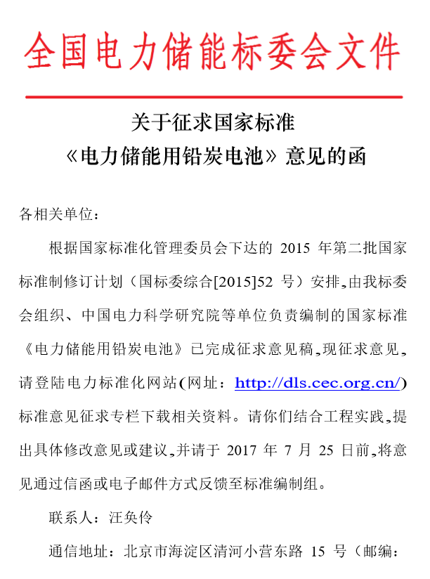 關(guān)于征求國家標(biāo)準(zhǔn) 《電力儲能用鉛炭電池》意見的函