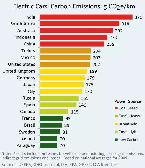 那么,電動車制造產(chǎn)生的碳排放占電動車生命周期內(nèi)總排放多大比例呢?這個(gè)問題要看在哪個(gè)國家,因?yàn)楦鲊l(fā)電結(jié)構(gòu)(化石能源發(fā)電比例和輸變電損失)有所不同。以中國為例,電動車生命周期內(nèi)單位碳排放為258克/公里,那么生產(chǎn)制造電動車過程碳排放占比約為27%。而在低碳電源為主的國家,比如法國,電動車生命周期內(nèi)單位碳排放為93克/公里,那么電動車制造碳排放占比高達(dá)75%。