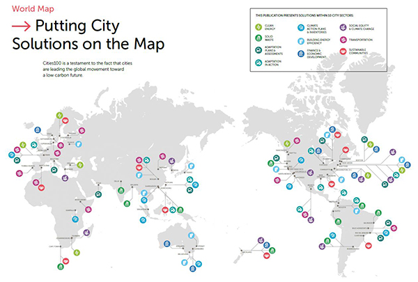 100城項(xiàng)目分布圖。本文圖片除特殊標(biāo)注外均來(lái)自:100 solutions for climate action in cities