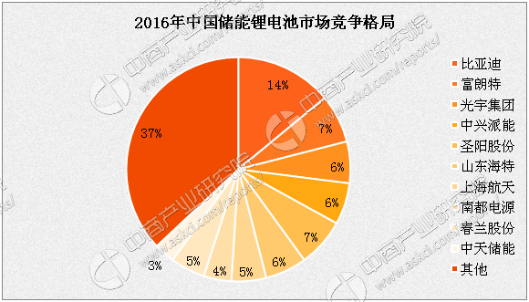 中商產(chǎn)業(yè)研究院《2017-2022年中國鋰電池市場調(diào)研及預(yù)測報告》顯示,2016年中國儲能鋰電池市場規(guī)模約52億元。其中,儲能電池市場占比最大的是比亞迪,為14%;其次是富朗特及圣陽股份,均為7%。