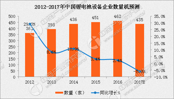2016年我國鋰電池設(shè)備企業(yè)462價,同比增長2.4%,隨著鋰電池設(shè)備企業(yè)數(shù)量增長逐年下滑,中商產(chǎn)業(yè)研究院預(yù)計2017年中國鋰電池設(shè)備企業(yè)約435家。