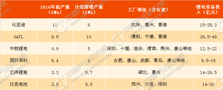 2017年國內(nèi)動力電池廠商擴產(chǎn)計劃對設(shè)備的需求