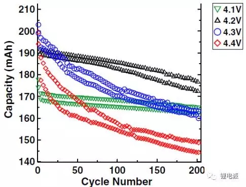 由圖中可以看出,在較高截止電壓條件下,活物質(zhì)克容量、電池容量都高,但是電池容量和材料的克容量衰減地也更快。反而是較低的截止電壓(4.2V以下)下,電池容量衰減緩慢,循環(huán)壽命更長。