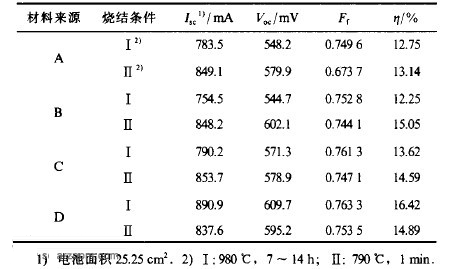 可以看到,經(jīng)高溫,長(zhǎng)時(shí)間燒結(jié)的電池比經(jīng)低溫短時(shí)間燒結(jié)的電池其填充因子Ff都有明顯提高。說(shuō)明這一燒結(jié)過(guò)程對(duì)改善歐姆接觸有良好的作用。然而,對(duì)采用A,B,C3種來(lái)源硅材料的電池來(lái)說(shuō),這以過(guò)程明顯降低了短路電流,開(kāi)羅電壓而且抵消了Ff的增益,使轉(zhuǎn)換效率明顯下降。而對(duì)D材料則完全不同,長(zhǎng)時(shí)間的高溫?zé)Y(jié)使3 個(gè)指標(biāo)都有所改善,明顯提高了轉(zhuǎn)換效率。
