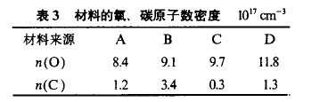 從表中可看出,D材料與前3種材料的碳,氧含量無(wú)大的差別。因而,導(dǎo)致前述差異的原因可以排除氧,碳雜質(zhì)含量的不同??赡艿脑蚴茿,B,C3種材料中金屬雜質(zhì)含量較多,高溫過(guò)程促進(jìn)了金屬雜質(zhì)與氧、碳沉淀的結(jié)合,使原本"潔凈"的沉淀成為有效的復(fù)合中 心,從而使高溫吸雜達(dá)不到其應(yīng)有的目的.另外,這一差異也可能是材料中不同生長(zhǎng)缺陷在高溫過(guò)程中發(fā)生不同演化造成的.