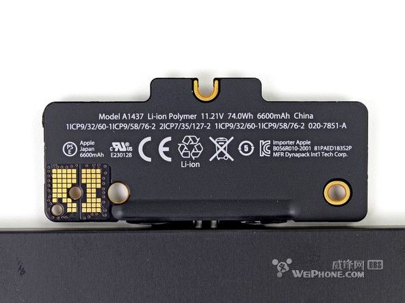 整塊電池一共由6個電池單元組成,整體看上去就像一個衣架。和 15 英寸 Retina Macbook Pro 的電池設(shè)計相比,“衣架”風格的設(shè)計為 13 英寸 Retina Macbook Pro 的內(nèi)部節(jié)省了許多空間。