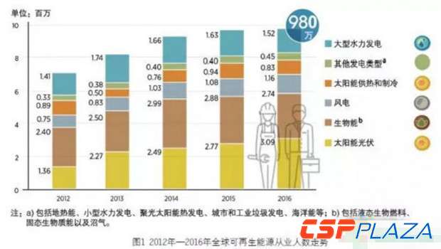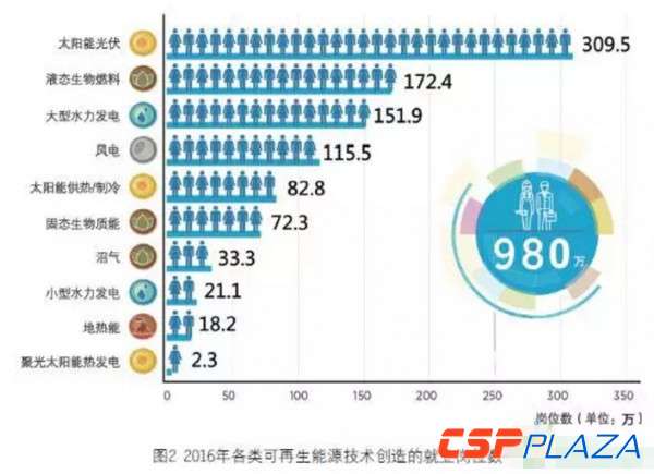 2016年,全球可再生能源產(chǎn)業(yè)共創(chuàng)造了980萬個(gè)就業(yè)崗位,同比增加1.1%。其中的830萬人集中在非水可再生能源行業(yè),比2015年高出2.8個(gè)百分點(diǎn)。