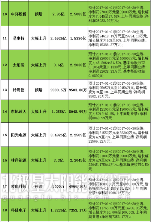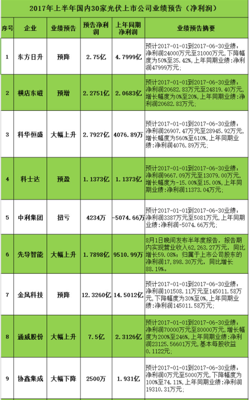 與此同時,光伏企業(yè)業(yè)績同樣表現(xiàn)搶眼。從已公布的30家國內(nèi)光伏上市企業(yè)的上半年業(yè)績預(yù)告看,絕大部分光伏企業(yè)處于盈利狀態(tài),只有少數(shù)幾家企業(yè)業(yè)績虧損或預(yù)降。而從凈利潤來看,不難發(fā)現(xiàn),增速最快的是科華恒盛,其漲幅高達560%左右,信義光能的EPC業(yè)務(wù)則是最讓人“眼紅”的。更多企業(yè)信息,請看下表: