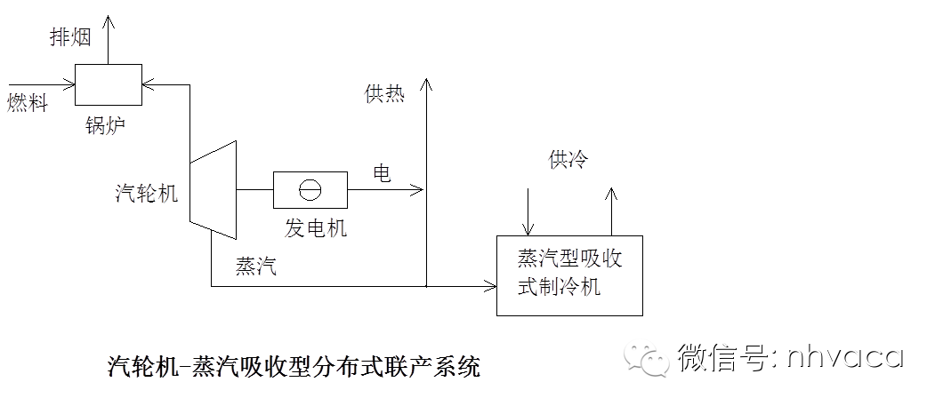 蒸汽型聯產系統,余熱鍋爐透平排氣的余熱被回收,用以產生蒸汽。夏季可利用蒸汽驅動蒸汽雙效溴化鋰吸收式機組制冷;冬季可利用這部分蒸汽直接供熱或驅動吸收式熱泵供熱。
