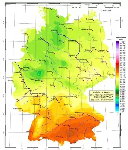 德國(guó)的日照條件并不好。年平均日照強(qiáng)度,最高的地區(qū)為1257千瓦時(shí)/平方米,最低的地區(qū)為951千瓦時(shí)/平方米,平均為1055千瓦時(shí)/平方米,比中國(guó)三類(lèi)地區(qū)的平均日照強(qiáng)度還要低。下圖是德國(guó)的日照強(qiáng)度地圖: