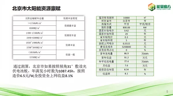 通過(guò)測(cè)算,北京市如果按照傾角31°敷設(shè)光伏電池板,年滿發(fā)小時(shí)數(shù)為1087.45h,按照造價(jià)6.5元/W,全投資全上網(wǎng)收益8.1%。