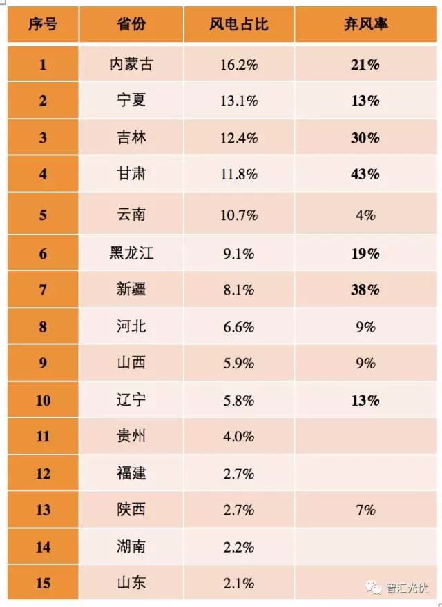 從上表可以發(fā)現(xiàn):風電占比在5.8%以上的省份,都有明顯的棄風。