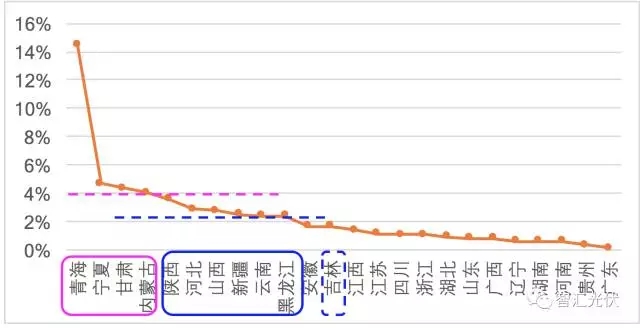 計算各省2016年風電的發(fā)電量與全省用電量的比值,估算出各省電力消納中國年風電電量的占比(因未考慮風電外送電量,占比偏高);將之與棄風率做對比,如下表所示。