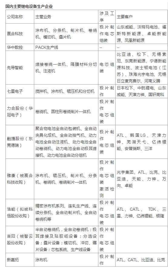各類鋰離子電池的制造可統(tǒng)一分為極片制作、電芯組裝、電芯激活檢測和電池封裝四個工序段,日本和韓國的鋰電設備居于世界領先地位,相對于國內(nèi)研發(fā)起步早,設備精度高、自動化程度較高、性能優(yōu)越、技術更加成熟,價格也相對價高。企業(yè)分工精細,基本上都是從事單一設備的研發(fā)制造,如國外生產(chǎn)鋰電卷繞設備的企業(yè)主要有日本皆藤、CKD以及韓國的Koem;生產(chǎn)涂布設備的企業(yè)主要有東芝、富士、東麗、平野;生產(chǎn)分條設備的企業(yè)主要有日本的西村等。