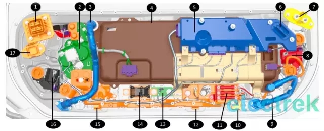 1. 充電口連接器 2. 快充電流接觸器總成 3. 通往 PCS 的冷卻管 4. 功率轉(zhuǎn)換器(PCS)5. 高壓控制器 6. 低壓連接器 7.PCS 的 12V 輸出口 8. 正極高壓電開關(guān) 9. 通往 PCS 的冷卻管 10. 通往乘客艙取暖器、空調(diào)壓縮機的高壓電連接器 11. 乘客艙取暖器、空調(diào)壓縮機和 PCS 直流輸出保險 12. 后軸電機高壓電連接器 13. 高壓電熱熔斷器 14. 未注明 15. 前軸電機高壓電連接器 16. 負(fù)極高壓電開關(guān) 17. 三相交流電連接器