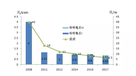 光伏發(fā)電投資、發(fā)電成本和電價也實現(xiàn)了大幅度下降,初始投資從2010年的約20元/瓦,降到2015年的8-9元/瓦,再到2017年的6-7元/瓦,光伏發(fā)電標桿電價從2011年的1.15元/千瓦時,降到2014年的0.9-1.0元/千瓦時,再到2017年0.65-0.85元/千瓦時。2016年光伏領(lǐng)跑技術(shù)基地最低中標電價達到0.45元/千瓦時,中標電價水平普遍低于當年光伏標桿電價15-35%。