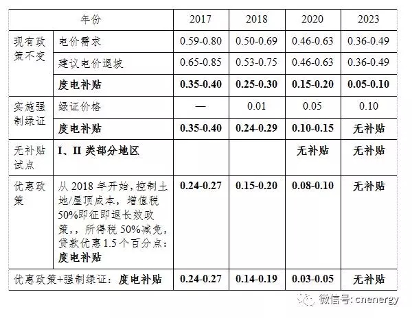 2020年新建項目度電補貼強度可以2017年基礎(chǔ)上降低0.2元/千瓦時左右,達到0.15-0.20元/千瓦時,2023年度電補貼強度可以2020年基礎(chǔ)上再降低0.1元/千瓦時左右,補度電貼強度普遍在0.1元/千瓦時以內(nèi)。