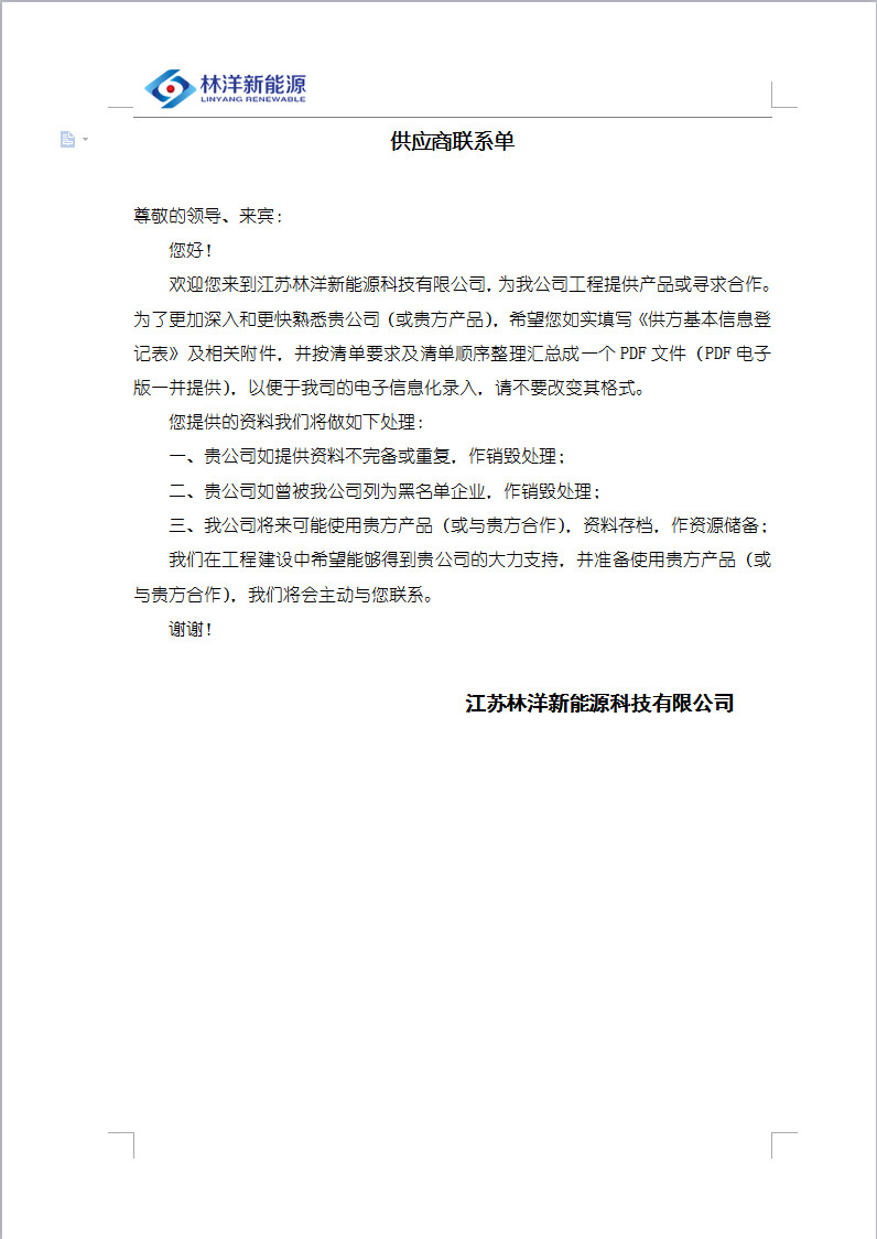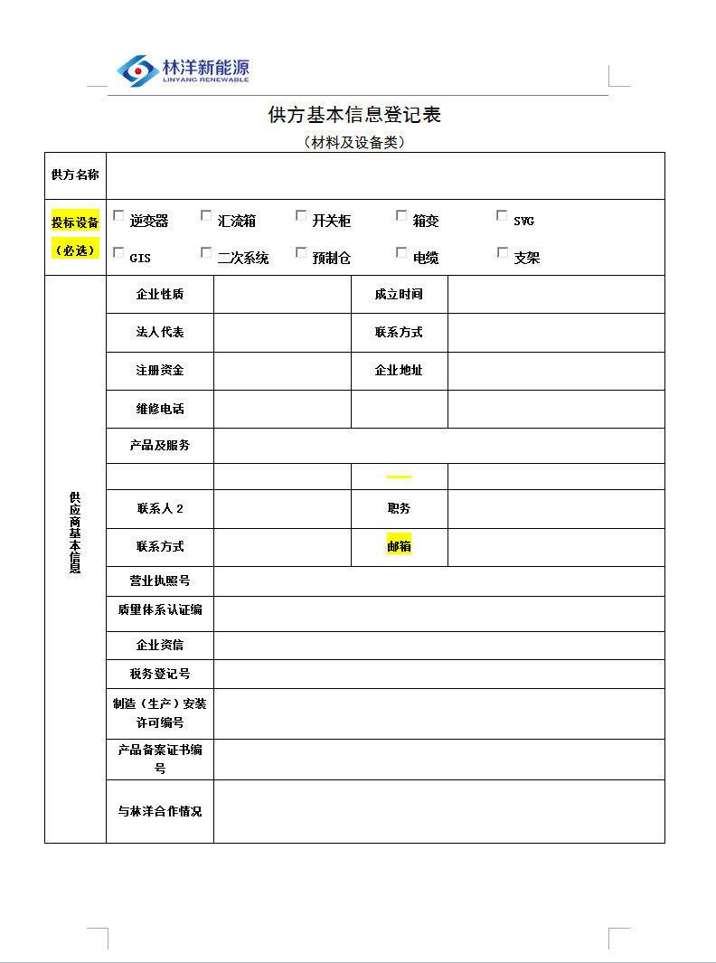 1.1、根據(jù)江蘇林洋新能源科技有限公司2017-2018年度1GW光伏電站的投資計(jì)劃需求,現(xiàn)就所需的逆變器、箱變、匯流箱、開關(guān)柜、二次設(shè)備、SVG、GIS、預(yù)制倉、支架、電纜單位在全國范圍內(nèi)進(jìn)行合格供應(yīng)商入圍評選活動。入圍有效期至2018年12月31日止。歡迎有意愿、有合格資質(zhì)條件的供應(yīng)商積極參加本次合格供應(yīng)商資格預(yù)審。