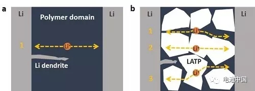 鋰離子在聚合物固態(tài)電解質(zhì)以及復(fù)合固態(tài)電解質(zhì)的傳輸路徑示意圖