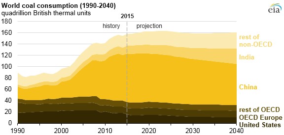 當(dāng)前,煤炭正在被淘汰,繼續(xù)被天然氣,可再生能源和核能替代。煤炭占世界能源消費(fèi)總量的比例預(yù)計(jì)將從2015年的27%下降到2040年的22%。在這個(gè)階段,中國依然是世界最大的煤炭消耗國。預(yù)計(jì)到2040年,中國煤炭消費(fèi)量將每年下降0.6%。
