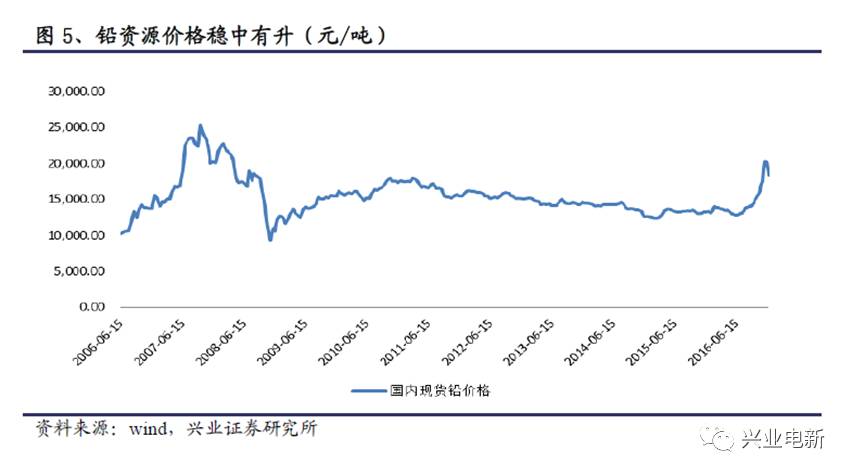 從圖4中可以看到,2016年下半年,活性炭?jī)r(jià)格先有一個(gè)明顯下跌,之后緩慢回升。此系列的上一篇報(bào)告中分析可以知道,近些年來(lái)鉛資源的價(jià)格大體呈先較為穩(wěn)定的狀態(tài),但在近半年價(jià)格有一定幅度的提升,具體走勢(shì)圖見(jiàn)圖5。