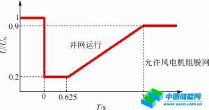 如果并網(wǎng)點(diǎn)不能實(shí)現(xiàn)有效的低電壓穿越,在短時(shí)間內(nèi)恢復(fù)(一般規(guī)定0.625 s,如圖2所示),會(huì)導(dǎo)致重大事故。2011年2月24日,甘肅電網(wǎng)酒泉風(fēng)機(jī)公司16個(gè)風(fēng)電場(chǎng)脫網(wǎng)598臺(tái),損失837.34 MW,電網(wǎng)頻率下降到49.854 Hz,風(fēng)電場(chǎng)出力損失54.4%;河北張家口也在2011年4月17日風(fēng)機(jī)脫網(wǎng)644臺(tái),電網(wǎng)頻率下降到49.815 Hz,風(fēng)電場(chǎng)出力損失48.5%。因此,國(guó)家電網(wǎng)在《風(fēng)電場(chǎng)接入電網(wǎng)技術(shù)規(guī)定(修訂版)》、《光伏電站接入電網(wǎng)技術(shù)規(guī)范》和《關(guān)于做好分布式電源并網(wǎng)服務(wù)工作的意見(jiàn)》中均明確規(guī)定,對(duì)目前風(fēng)力發(fā)電中3種主力風(fēng)力發(fā)電機(jī)均要求具有低電壓穿越能力,對(duì)光伏發(fā)電并網(wǎng)中的低電壓穿越問(wèn)題也提到議事日程。由超級(jí)電容器和變換器組成的儲(chǔ)能系統(tǒng),通過(guò)吸收(或釋放)電能平衡直流母線兩側(cè)的功率,既可以使發(fā)電機(jī)與電網(wǎng)故障相隔離,又可以提高風(fēng)電系統(tǒng)的低電壓穿越能力。