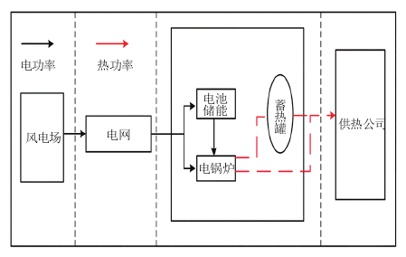 利用棄風(fēng)電量進行電供熱是解決“三北”地區(qū)風(fēng)問題的有效手段。夜間負荷低谷時段,利用谷電電或者協(xié)定的棄風(fēng)電價對蓄熱式電鍋爐加熱,一方面向熱管網(wǎng)提供熱負荷,另一方面將多余熱能儲存至蓄罐中,以滿足次日電價高峰期的熱負荷要求。然而電爐的功率調(diào)節(jié)系統(tǒng)受機械部件制約,調(diào)節(jié)速率與風(fēng)功快速波動不匹配,無法實現(xiàn)最大限度的消納風(fēng)電。電學(xué)儲能具有電能雙向流動,有功、無功的靈活調(diào)節(jié)等點,其協(xié)調(diào)電鍋爐能夠改善其調(diào)節(jié)靈活性,具備跟蹤風(fēng)功率的能力,提高風(fēng)電供熱的經(jīng)濟性。