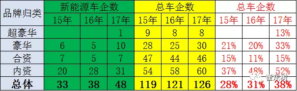 上表是按照品牌銷售的廠家口徑的數(shù)量,與合格證的廠家生產(chǎn)法人的口徑相對簡化,但權(quán)威的仍是法人單位的統(tǒng)計角度。對18年實施雙積分的最初的預(yù)期是企業(yè)能迅速推動插電混動和純電動的均衡發(fā)展,合資企業(yè)能夠推出新能源車。世界新能源車的隨著油價下跌的需求不旺,發(fā)展新能源車的熱情不高,新品推出不強。而合資企業(yè)的新能源車缺乏研發(fā)能力,外方導(dǎo)入需要一定時間,進度相對較慢。因此17年的合資企業(yè)推出新能源車的有7家占比15%,內(nèi)資企業(yè)推出新能源車的有31家,占52%。