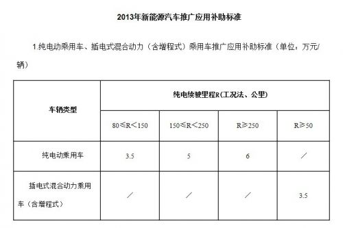 (四)補助標(biāo)準(zhǔn)。補助標(biāo)準(zhǔn)依據(jù)新能源汽車與同類傳統(tǒng)汽車的基礎(chǔ)差價確定,并考慮規(guī)模效應(yīng)、技術(shù)進步等因素逐年退坡。2013年具體補助標(biāo)準(zhǔn)見附件。2014年和2015年,純電動乘用車、插電式混合動力(含增程式)乘用車、純電動專用車、燃料電池汽車補助標(biāo)準(zhǔn)在2013年標(biāo)準(zhǔn)基礎(chǔ)上分別下降10%和20%;純電動公交車、插電式混合動力(含增程式)公交車標(biāo)準(zhǔn)維持不變。
