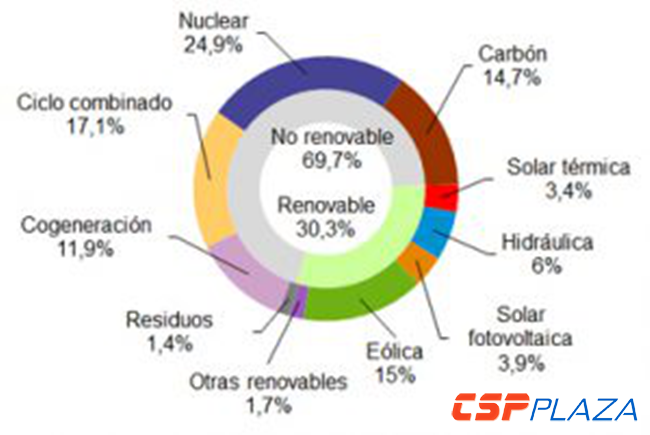 據CSPPLAZA此前報道,西班牙5、6、7、8月份光熱發(fā)電量分別占當月總發(fā)電量的3.4%、3.8%、4.1%與3.6%。