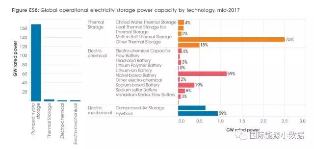 中國(guó)儲(chǔ)能網(wǎng)訊:根據(jù)國(guó)際可再生能源署(IRENA)日前發(fā)布“電力儲(chǔ)存與可再生能源——2030年的成本與市場(chǎng)”報(bào)告,到2017年中全球儲(chǔ)能裝機(jī)容量為176吉瓦,其中169吉瓦抽水蓄能(占96%);3.3吉瓦熱能儲(chǔ)存(1.9%);1.9吉瓦電池儲(chǔ)能(1.1%);1.6吉瓦機(jī)械儲(chǔ)能(0.9%)。