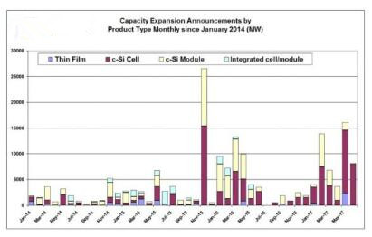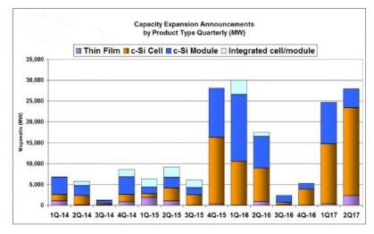 不出所料,2017上半年的容量夸張?jiān)鲩L主要由中國驅(qū)動(dòng),并且轉(zhuǎn)向高效的太陽能電池技術(shù)。今年二季度,全球公布的光伏生產(chǎn)容量擴(kuò)張超28吉瓦,其中包括超2.3吉瓦的薄膜擴(kuò)張,超21吉瓦的太陽能電池容量,及4.6吉瓦的專用模塊組裝。