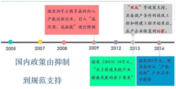 中國光伏產(chǎn)業(yè)是從2005年開啟的,歷經(jīng)12年已成為全球最大的需求市場和生產(chǎn)地。在12年中,2009年的國發(fā)38號文將多晶硅歸入了產(chǎn)能過剩行業(yè),做了“高耗能和高污染”產(chǎn)業(yè)嚴(yán)格限制,市場備受打擊。而2013年時(shí),國發(fā)24號文再次提出了“關(guān)于促進(jìn)光伏產(chǎn)業(yè)健康發(fā)展的若干意見”,加之“雙反”等政策的出現(xiàn),讓具備投產(chǎn)條件的技改工程和新建工程得以重見天日,多晶硅在產(chǎn)企業(yè)也恢復(fù)至16家。2016年,國發(fā)892號文件又將多晶硅從產(chǎn)能過剩的產(chǎn)業(yè)名單中剔除,上下游市場振奮不已。