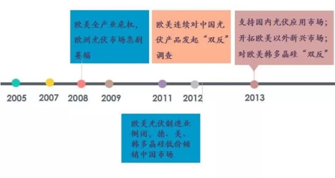 而另一方面,國際經(jīng)濟(jì)金融和貿(mào)易政策也深刻影響了行業(yè)走勢,使整體市場格局顯現(xiàn)了較大變化。2008年時(shí),歐美全產(chǎn)業(yè)危機(jī)爆發(fā),歐洲光伏市場急劇萎縮,也就是那時(shí)中國多晶硅的售價(jià)全線潰退,每公斤上百美元的多晶硅跌破了30美元。歐美相關(guān)機(jī)構(gòu)也連續(xù)對中國光伏產(chǎn)品發(fā)起了“雙反”調(diào)查。直至2013年時(shí),支持中國光伏應(yīng)用市場的各項(xiàng)政策開啟,歐美以外新興市場成為企業(yè)出海首選、對歐美韓的中國多晶硅“雙反”等政策也賦予了行業(yè)新的生命力。