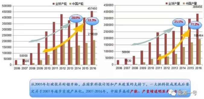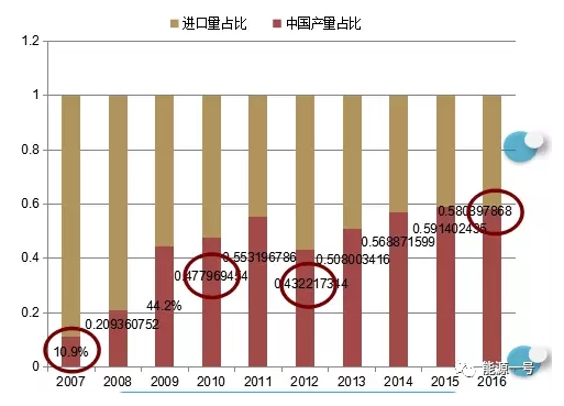 技術(shù)進(jìn)步、降本提質(zhì)皆為光伏產(chǎn)業(yè)的順利擴(kuò)容帶來了市場機(jī)遇,市場得以快速健康地發(fā)展。到2016年底,中國多晶硅產(chǎn)量占總銷量達(dá)58.1%。結(jié)束了多晶硅依賴進(jìn)口的歷史。