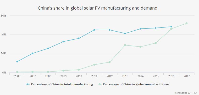 國際能源署(IEA)在2017年可再生能源報告中稱,中國已占全球太陽能電池制造總產(chǎn)能的60%,占全球光伏裝置使用和需求的50%。2016年,全球范圍光伏裝置的增長率首次超過其他能源載體,主要原因就是中國帶領(lǐng)美國和印度的光伏裝置增加。因此,中國的市場和政策變化,將影響到全球光伏裝置的供求與價格。