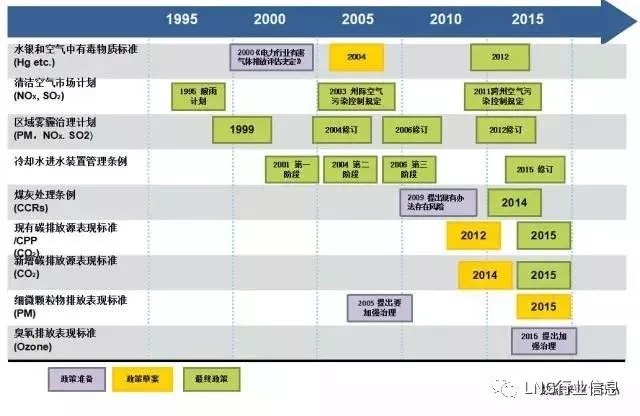 ? 2002年美國氣電裝機(jī)增量達(dá)到5400萬千瓦,2013年氣電裝機(jī)總量達(dá)4.25億千瓦,占全國裝機(jī)總量的42%,期間政府出臺了大量環(huán)保政策限制電廠污染物排放。